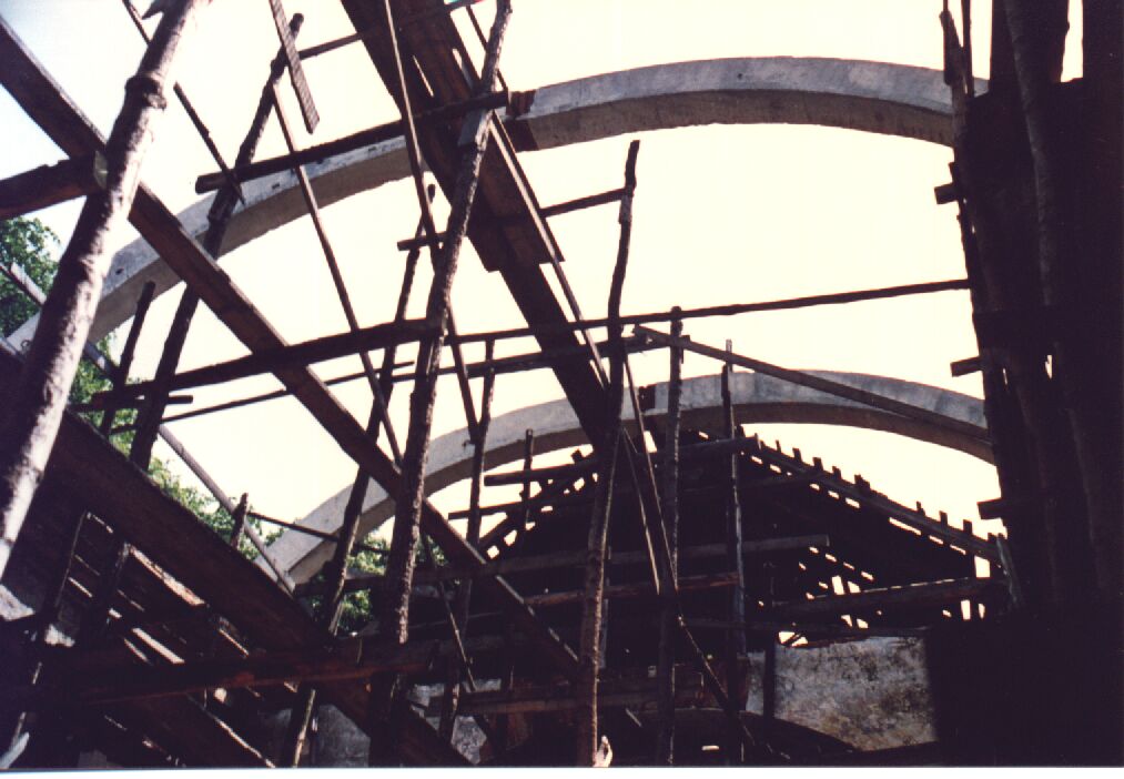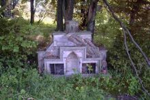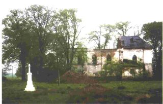 Nachdem die kleine Kirche für die nun mittlerweile über eintausend Gläubiger zählenden Gemeinde zu klein geworden war und vorzeitig durch Fäulnis baufällig wurde, so wurde 1860 mit dem Bau einer neuen, steinernen Kirche begonnen. Jeder Grundwirt hatte durchschnittlich 25 Gulden in bar, 37 Fuhren und 6 Arbeitstage leisten müssen. *** Das Bild auf der linken Seite zeigt die Kirche wie sie 1939 kurz vor der Umsiedlung noch erhalten war. 1990 gab es die ersten Fotos der verfallenen Kirche zu sehen. So konnte sie nicht bleiben. Eine Spendenaktion für den Wiederaufbau wurde gestartet und die Kirche neu errichtet. |