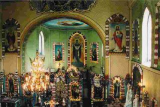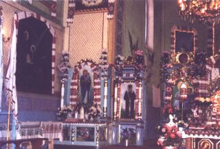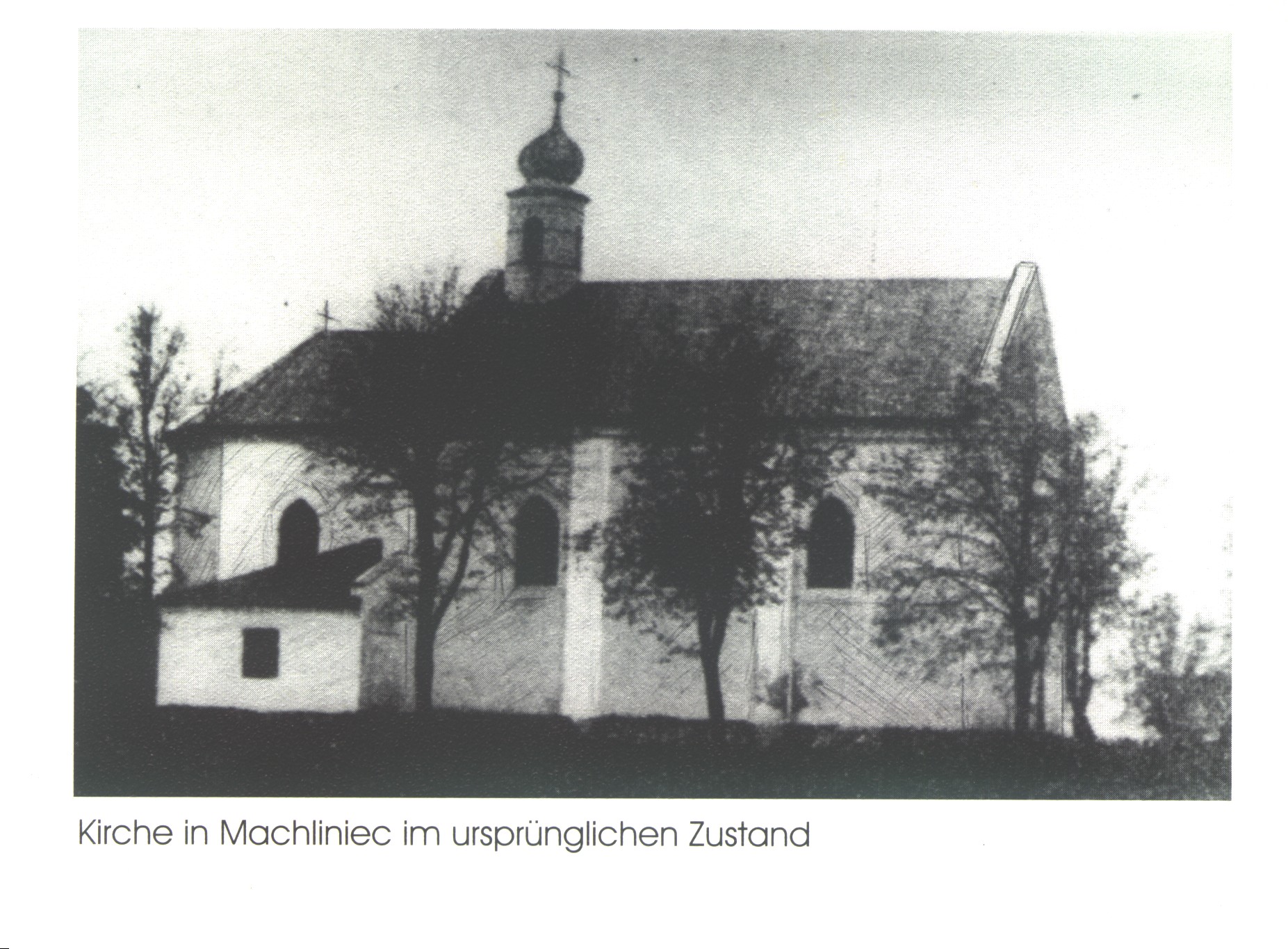 Rosenkranz. Am 25. Januar 1837 reichten die damaligen Stammdörfer Machliniec, Nowe Siolo, Kornelowka und Izydorowka ihr erstes Gesuch an das Kreisamt Stryj und an das bischöfliche Konsistorium Lemberg um Errichtung einer eigenen Kapelle und Bewilligung eines Seelsorgers. Im Jahre 1842 konnte die Kapelle endlich gebaut werden, jedoch mußten die Siedler es fast auf ganz eigene Kosten tun, da der Gutsherr Bobrzanski von Daszawa nur Lehm, Pietruski von Izydorowka nur Steine für das Fundament und Dobrowolski von Nowe Siolo-Korneluwka gar nichts beisteuerten. Die Kapelle war von weichem Holz gebaut, sie maß in der Länge nur 12 und in der Breite 8 Ellen (1 große Elle = 80 cm) und bot 80 Personen Platz. Die Einweihung der Kirche erfolgte noch im Jahre 1842 durch Domherrn Sebastian Iwanski. Die Figur der Schutzheiligen der Pfarre, des heiligen Johannes von Nepomuk, Landespatron von Böhmen, hatten die ersten Ansiedler mitgebracht. Die auf dieser Seite dargestellten Bilder entstammen dem "Galizianer Gedenk-Kalender 2000" |