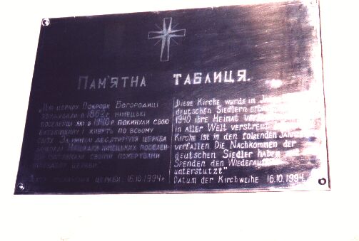 "Die Kirche wurde im Jahre 1862 von deutschen Siedlern fertig gestellt, die im Jahre 1940 ihre Heimat verließen und nun in aller Welt verstreut leben. Die Kirche ist in den folgenden Jahrzehnten verfallen. Die Nachkommen der deutschen Siedler haben mit Spenden den Wiederaufbau unterstützt. " Datum der Kirchweihe 16.10.1994 Der Gedenkstein an die zunächst