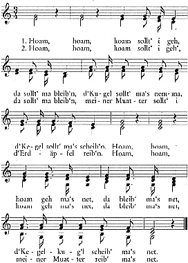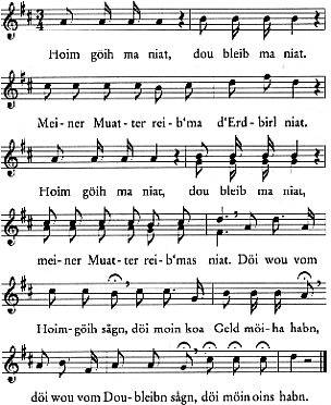 Sachsen ist sie schon 1680 belegt. Das Lied wanderte möglicherweise von der Oberpfalz in fast alle Richtungen weiter. Die Verbreitung zeigt eine gewisse Vorliebe bei den Altschwaben für diesen vieldeutigen Text und die Melodie in der Art einer Mazurka. Der Text kann durch die Soldaten in der Zeit der Donaumonarchie nach Sathmar gelangt sein. Ob fränkisch, schwäbisch oder bayrisch, kann nicht geklärt werden, da die Sathmarer als Schwaben stets eine hohen Prozentsatz ihrer LIeder mit ihrer Mundart überformten. Dort sind daneben noch insgesamt neun Lieder in Moll überliefert. Das läßt die Annahme zu, daß eine solche alte Melodie in Sathmarschwaben der bekannten Strophe beigefügt worden ist, die um eine zweite und dritte zu dem heute uns bekannten "Sathmarlied" erweitert wurde. |