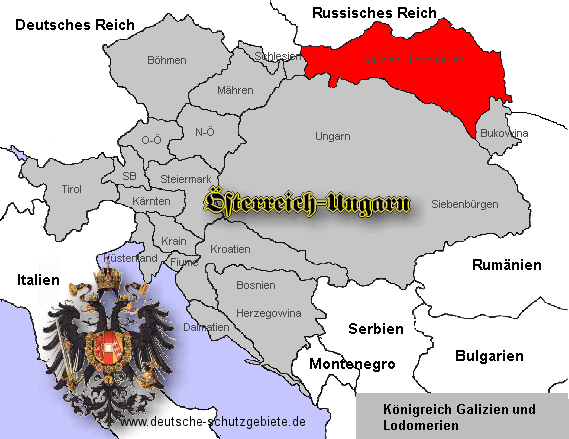 | Galizien und Lodomerien - Lage in der Donaumonarchie | Wappen | Galizien und Lodomerien - Karte 1914 |